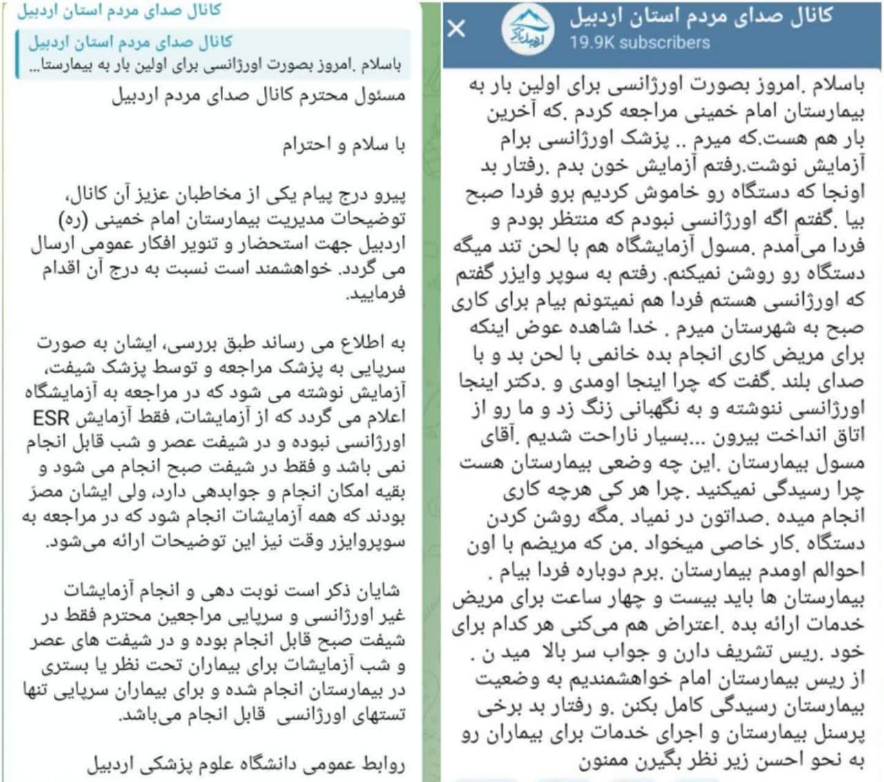 پیرو درج پیام یکی از مخاطبان عزیز آن کانال، توضیحات مدیریت بیمارستان امام خمینی (ره) اردبیل جهت استحضار و تنویر افکار عمومی ارسال می گردد. خواهشمند است نسبت به درج آن اقدام فرمایید.