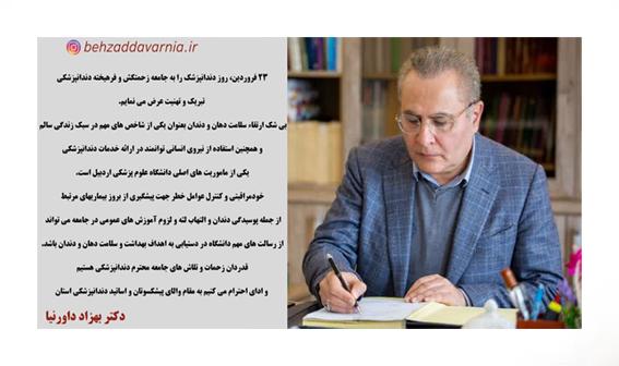 پیام تبریک دکتر بهزاد داورنیا، رئیس دانشگاه علوم پزشکی اردبیل بمناسبت ۲۳ فروردین، روز دندانپزشک