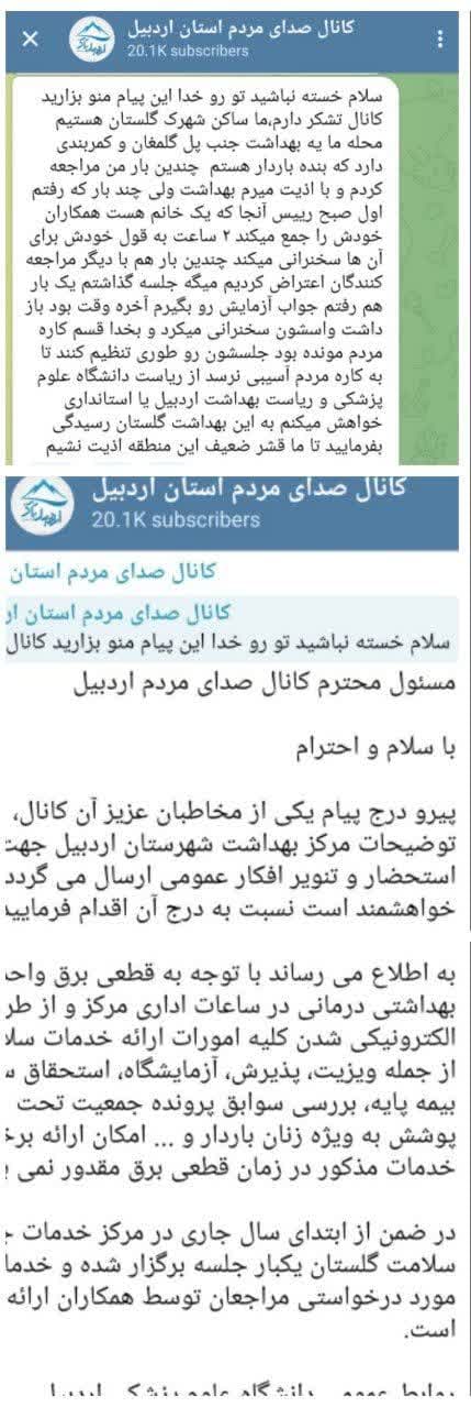 پیرو درج پیام یکی از مخاطبان عزیز آن کانال، توضیحات مرکز بهداشت شهرستان اردبیل جهت استحضار و تنویر افکار عمومی ارسال می گردد. خواهشمند است نسبت به درج آن اقدام فرمایید.