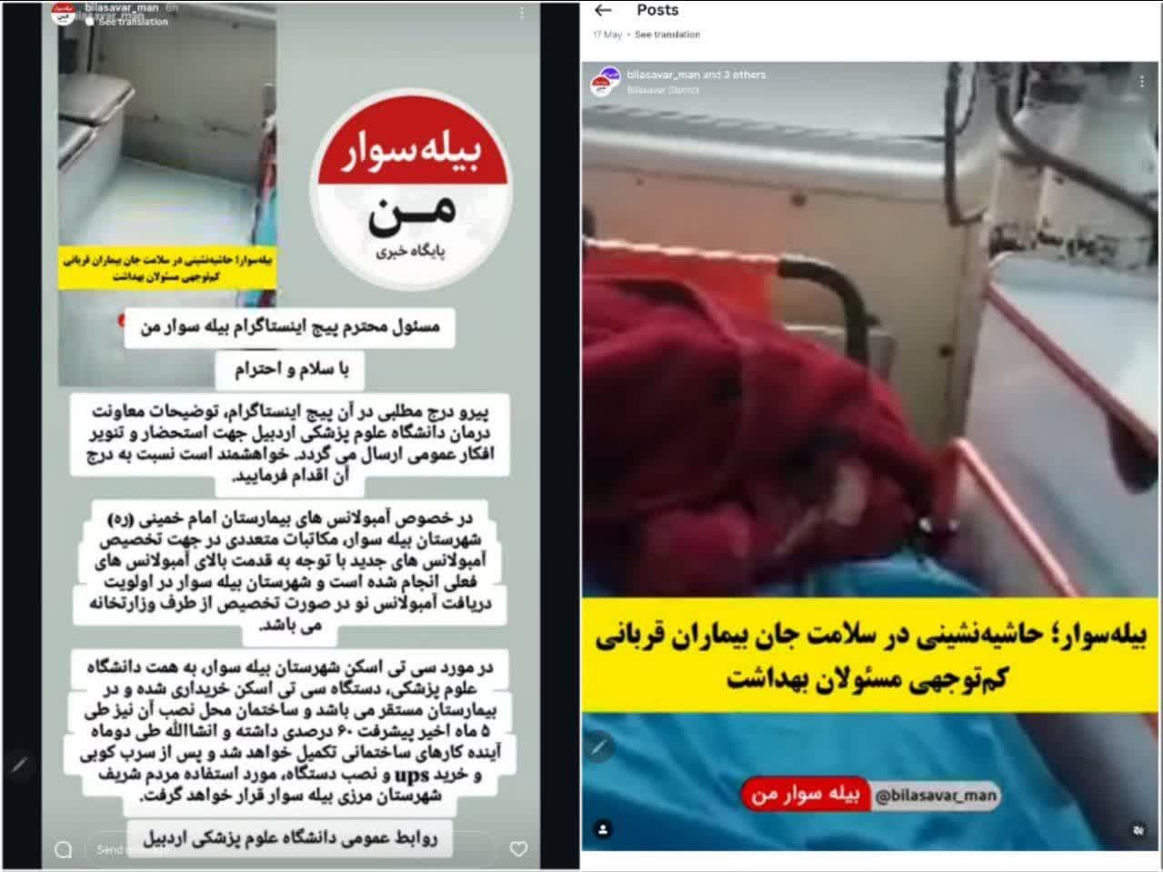 توضیحات معاونت درمان دانشگاه علوم پزشکی اردبیل در خصوص آمبولانس های بیمارستان امام خمینی (ره) شهرستان بیله سوار
