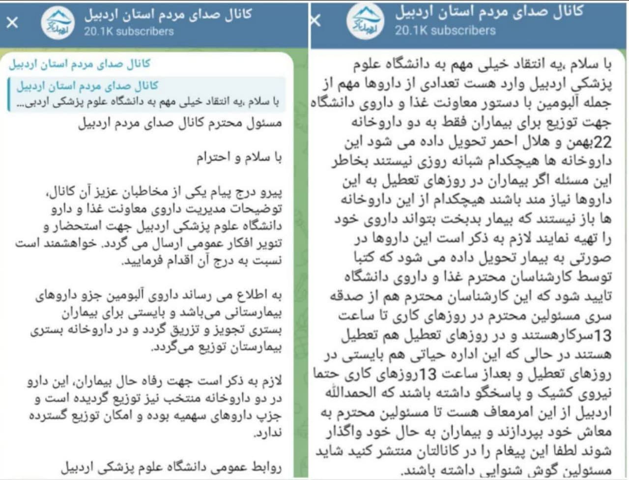 پیرو درج پیام یکی از مخاطبان عزیز آن کانال، توضیحات مدیریت داروی معاونت غذا و دارو دانشگاه علوم پزشکی اردبیل جهت استحضار و تنویر افکار عمومی ارسال می گردد. خواهشمند است نسبت به درج آن اقدام فرمایید.