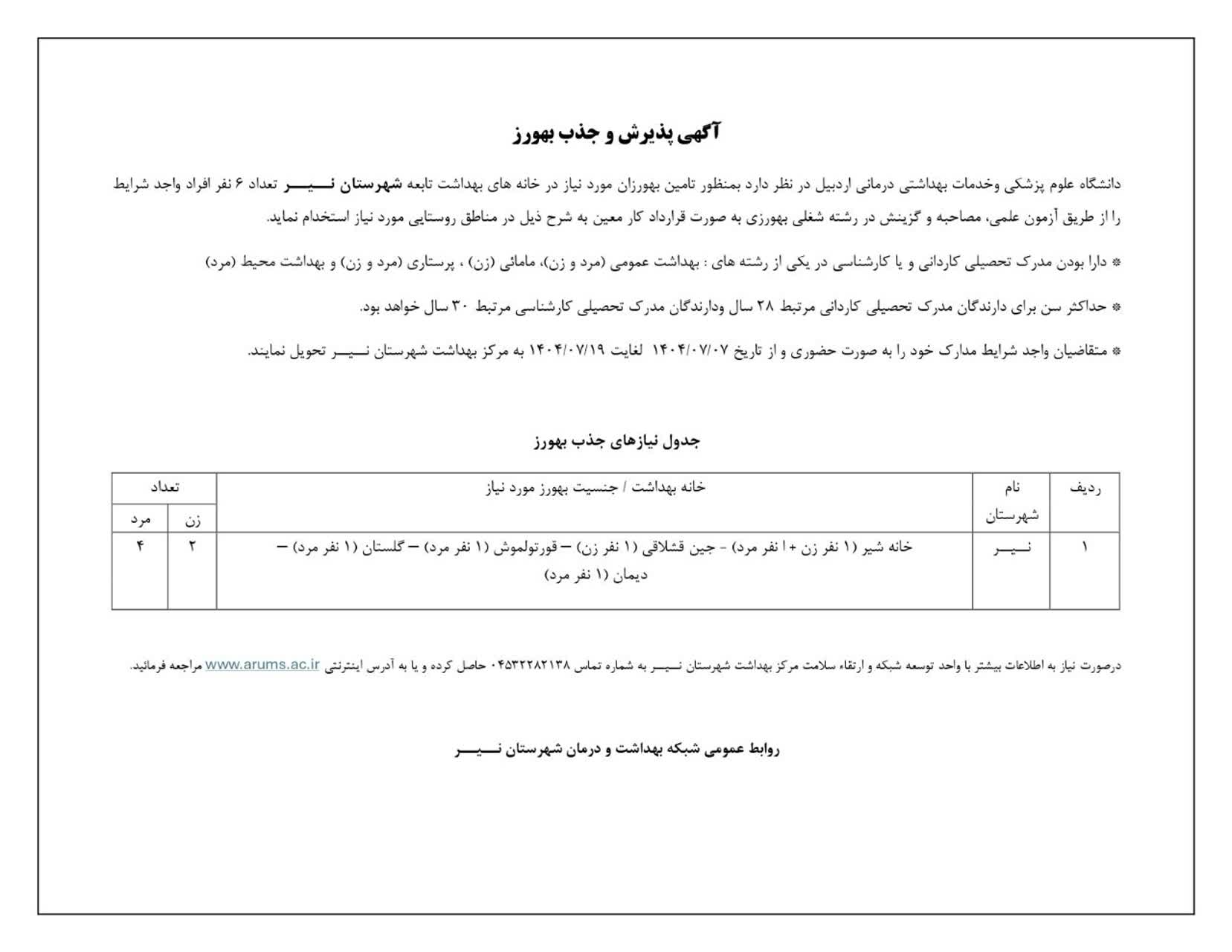 آگهی پذیرش و جذب بهورز در شهرستان نیر ۰۲ مهر ۱۴۰۴ | ۱۰:۰۳ کد : ۳۹۳۸۹ خبر شهرستانها ارسال به دیگران نام شما ایمیل شما ایمیل دریافتکننده ارسال انصراف تعداد بازدید:۷