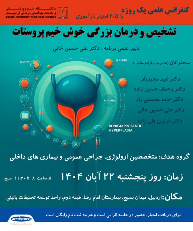 کنفرانس علمی تشخیص و درمان بزرگی خوشخیم پروستات ۱۹ آبان ۱۴۰۴ | ۱۳:۱۸ کد : ۴۰۱۹۰ اخبار کوتاه ارسال به دیگران نام شما ایمیل شما ایمیل دریافتکننده ارسال انصراف تعداد بازدید:۱۸