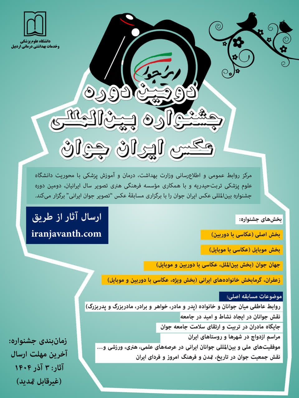 مرکز روابط عمومی و اطلاع‌رسانی وزارت بهداشت، درمان و آموزش پزشکی با محوریت دانشگاه علوم پزشکی تربت‌حیدریه و با همکاری مؤسسه فرهنگی هنری تصویر سال ایرانیان، دومین دوره جشنواره بین‌المللی عکس ایران جوان را با برگزاری مسابقۀ عکس “تصویر جوان ایرانی” برگزار می‌کند.