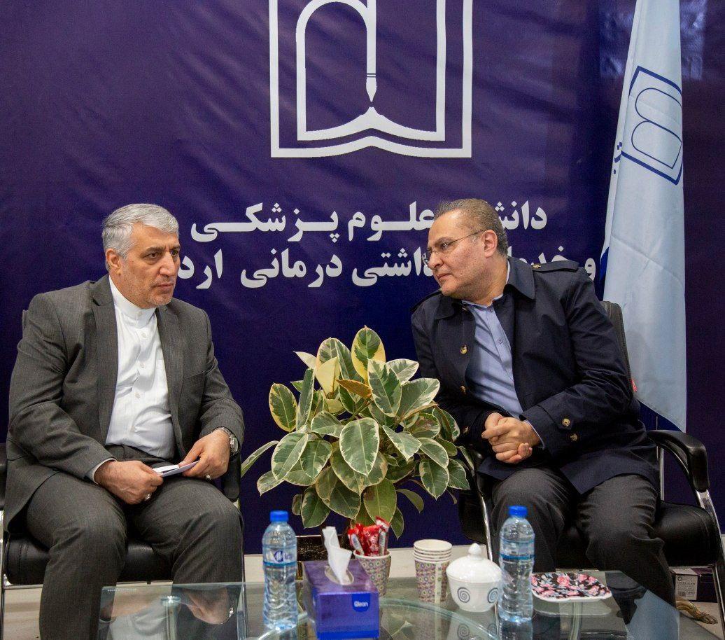 دیدار دکتر مجتبی دمیرچیلو، سفیر ایران در جمهوری آذربایجان با دکتر بهزاد داورنیا، رئیس دانشگاه علوم پزشکی اردبیل در غرفه دانشگاه در نمایشگاه اکسپو ۲۰۲۵ اردبیل